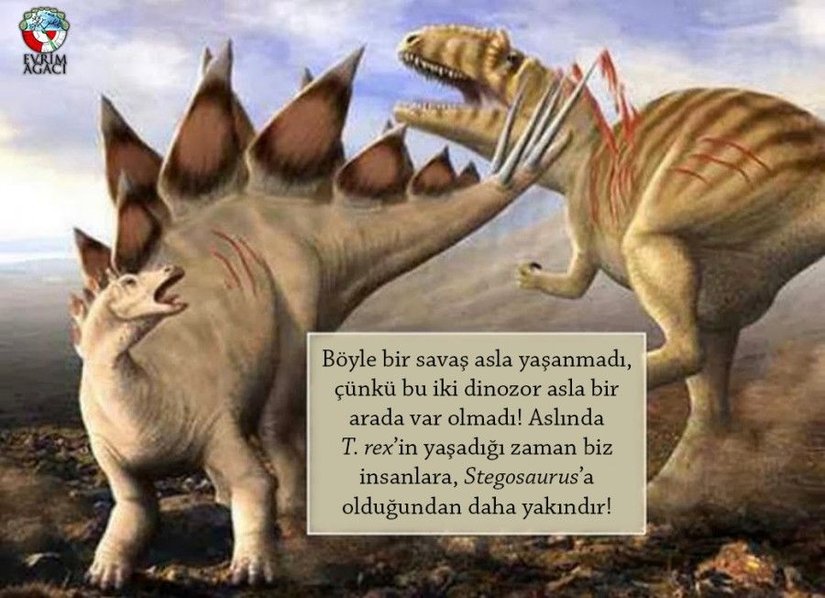 Hatta ilk evrimleşme dönemlerini dikkate alacak olursak, çok ilginç bir gerçekle karşılaşırız. Stegosaurus'un evrimleştiği zaman ile T. rex'in evrimleştiği zaman arasında 103 milyon yıl vardır. T. rex'in evrimleştiği zaman ile biz Homo sapiens'in evrimleştiği zaman arasında ise 66 milyon yıl vardır! Yani Stegosaurus ile T. rex arasındaki zaman aralığı, T. rex ile bizim aramızdakinden bile daha uzundur! Bir diğer deyişle T. rex bizlere, o meşhur savaştaki rakibi Stegosaurus'tan 30 küsür milyon yıl daha yakın bir zamanda yaşamıştır!