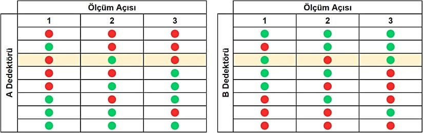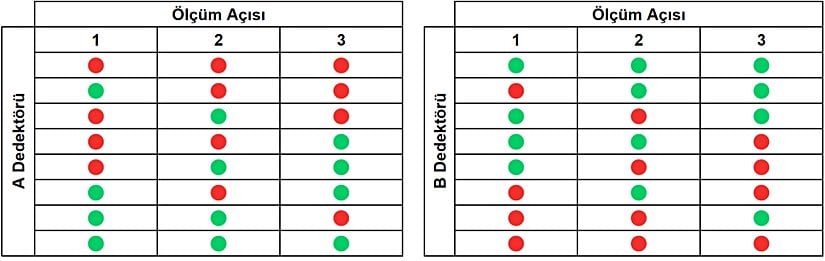 İşte bu deneyi bütün açılarla tekrar edebilirsiniz ve ölçüm sonuçlarınızı not alıp, bir matematiksel formüle çevirebilirsiniz. Bunu yaptığınızda, iki dedektörde zıt sonuç ("biri kırmızıyken diğeri yeşil") alma ihtimalinizin dedektörün açısına bağlı bir denklem olduğunu göreceksiniz.