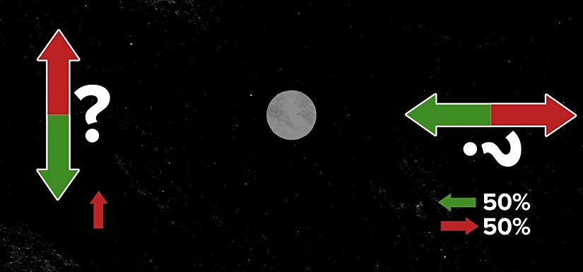 Sixty SymbolsPeki, şimdi parçacıklardan birinin spinini düşey eksende ölçerken, diğerininkini düşeyde değil de yatay eksende ölçmeye kalksak ne olurdu? Diyelim ki soldaki parçacığı düşeyde "yukarı" spinli ölçtük. Sağdaki ne olurdu? Eğer süperpozisyon deneylerini anladıysanız, bunu doğru tahmin edebilmelisiniz: Bu iki spin birbirinden bağımsız olduğu için, birini ölçmeniz diğeri hakkında hiçbir bilgi vermez. Dolayısıyla yan yatırdığınız sensörünüzde %50 ihtimalle yukarı, %50 ihtimalle aşağı ölçerdiniz. Daha doğrusu bu deneyi giderek artan sayıda tekrar ettikçe, olasılığın %50-%50 dağıldığını görürdünüz.