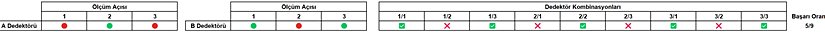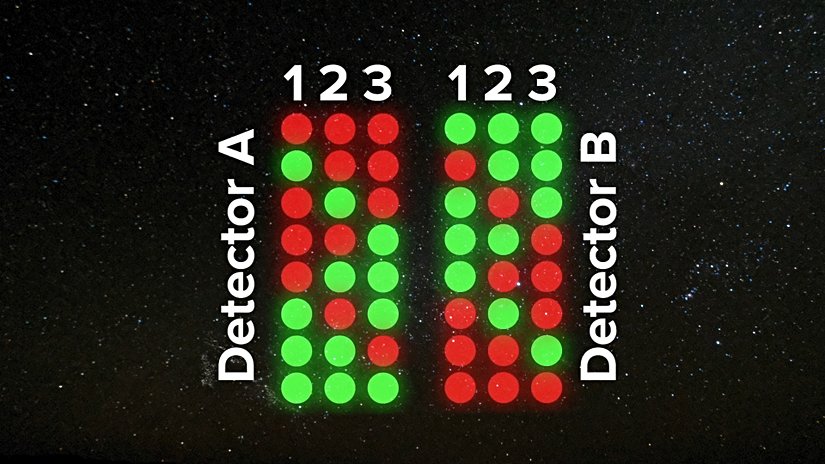 Bell Eşitsizliği Teoremi'ni test etmek için, bu aparatlardan iki tane gerekmektedir. Kolaylık olsun diye, dedektörleri kırmızı ve yeşil oklarla gösterelim: