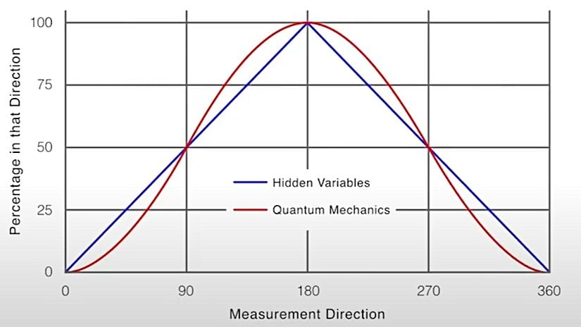 Tüm bunları bilimin temel prensipleri açısından, daha "meta" bir şekilde ele alarak, deney sonuçlarını daha iyi anlamanızı sağlayabiliriz. Aşağıdaki grafikte mavi renkli çizim klasik fiziğin, yani Einstein-Podolski-Rosen üçlüsünün "Gizli Değişken Hipotezi'nin" farklı açı kombinasyonlarında görmeyi beklediği veri dağılımını göstermektedir; kırmızıysa Bohr ve arkadaşlarının aynı ölçüm için kuantum mekaniği öngörüsünü göstermektedir: