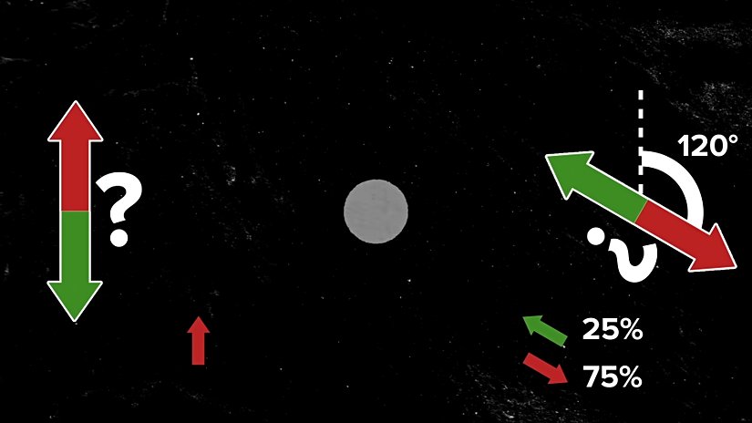 Sixty SymbolsKırmızı ölçümünün daha yüksek ihtimalle olmasının nedeni, sensörün o tarafının, elektronun gerçekte olmaya çalıştığı spine daha yakın olmasıdır. Yukarıdaki grafikten inceleyecek olursanız, soldaki elektron düşey eksende "yukarı" çıktıysa, sağdaki elektron aslında "aşağı" sonuç verecektir; ama sensör o eksende ölçüm yapmamaktadır. Bunun yerine, "kırmızı" ile işaretli olan taraf, "aşağı" olan spine daha yakın olduğu için, ölçüm sonucu da daha sıklıkla "kırmızı" olarak çıkmaktadır. Ama arada sırada "yeşil" sonuç almak da mümkündür. İşte 120 derecelik bir açıda, o "arada sırada" miktarı tam olarak %25'tir (ve "sıklıkla" olarak nitelediğimiz "kırmızı ölçme" oranımız da tam olarak %75'tir).