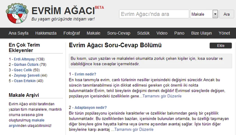 Evrim Ağacı internet sitesinin ilk versiyonu (9 Mart 2011)