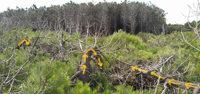 Y. Efe Özturan (İstanbul - Durusu)Pinus maritima, çeşitli aralıklarla oluşturduğu krumholz alanlarına ait fotoğraflarda, bitkilerin, rüzgârın etkisiyle yere yatay pozisyonda bir gelişme gösterdiği görülmektedir.