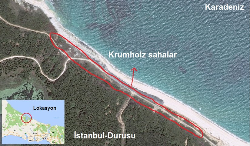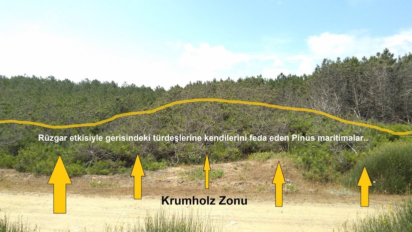 Bölgede dikkatimizi çeken hususlardan birisi de kuzeybatı, kuzey ve kuzeydoğu yönlü rüzgarların etkisi altında kalan bitkilerin formasyonundaki değişikliklerdir. 1960 yıllarında dikilen, aşağıda kabaca lokasyonunu görmekte olduğunuz kıyı bandında bulunan sahil çamlarının (Pinus maritima) rüzgârın etkisiyle yıpranmış, adeta Bonsai ağaçları gibi görünüyor olmaları ve kıyı bandı boyunca aynı nedenle form değişikliğine uğrayan ağaç toplulukları bölgeyi, ülkemizde krumholz sahalara verilebilecek örnek yerler arasına taşıyabilir. Elbette bu bilgi öncelikle coğrafyacılar için sonrasında coğrafi bilgi-ye ilgi duyan tüm bilim dalları için bir değer ifade edebilir