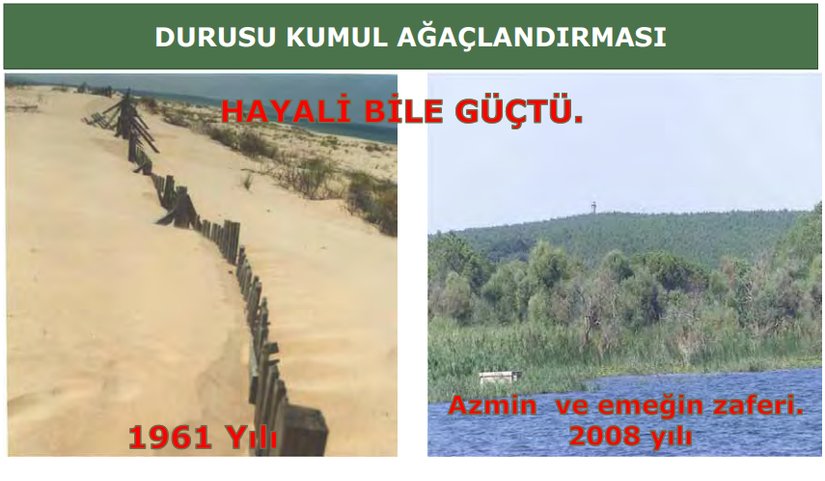 Mahmut Serdar KeskinSöz konusu alan, 1959 yılında ilgili kurumların çalışmasıyla ülkemiz ölçeğinde önemli ve ilklerden olan kumul ağaçlandırması sayesinde çölleşme tehdidinden kurtarılmıştır. 1960’lı yıllarda 2102 hektar alana dikilen fidanların günümüzdeki görüntüsünü ülkemizde çölleşme tehdidi altında olan yerlerde de görmek sanırız hepimizin isteğidir.