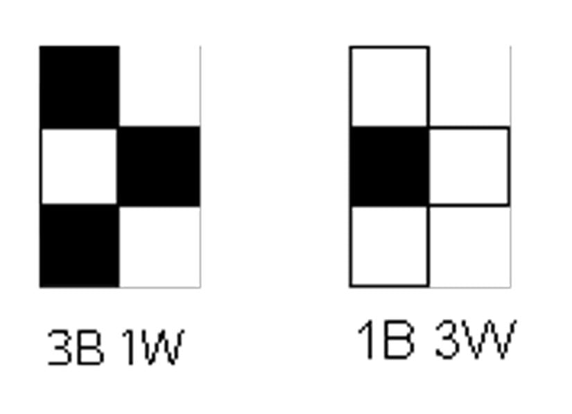 Görebileceğiniz gibi, bu tahtadaki siyah ve beyaz kareler birbirine eşittir. Ancak şimdi bir de T-taşlarına bakalım. Bu taş, 2 formda gelebilir: "3 siyah 1 beyaz" veya "3 beyaz 1 siyah".