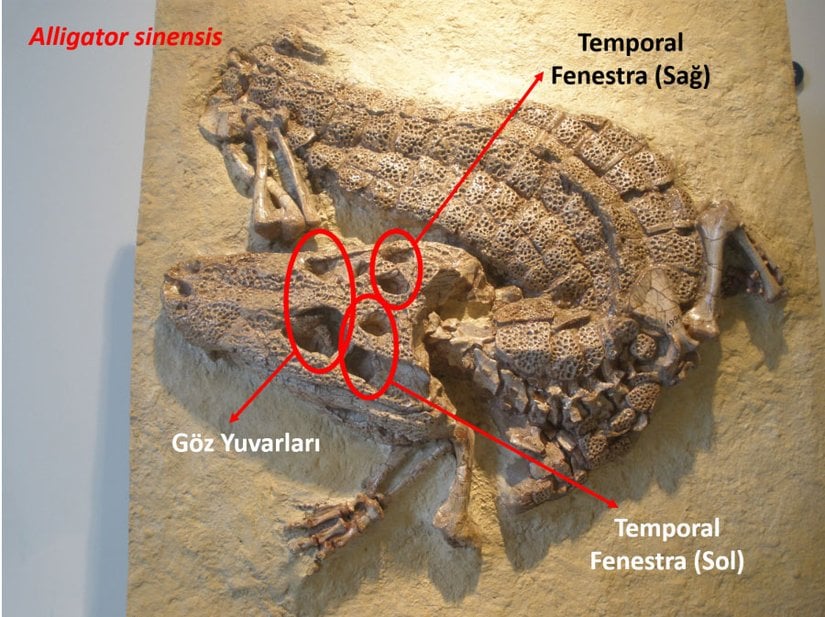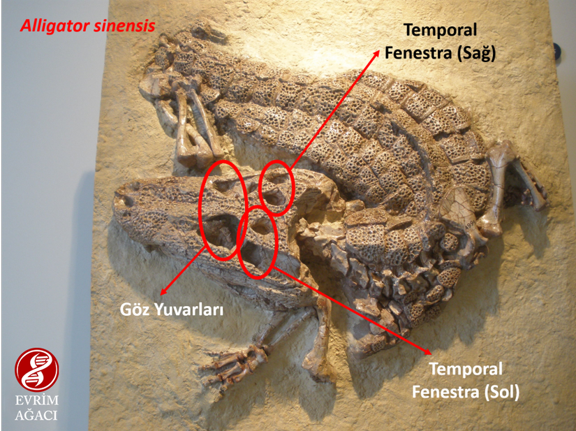 Üçüncü olarak, timsahlar Sürüngenler Sınıfı'na aittirler. Sürüngenler diapsid canlılardır. Yani kafatasları içerisinde, göz yuvarları haricinde, kafatasınun üst kısmında, her yanda, biri göz hizasının üstünde, biri altında olmak üzere 2'şer adetten toplamda 4 tane büyük oyuk/çukur bulunur. Bu çukurlar, tüm sürüngenlerde ve kuşlarda vardır. Ana fotoğraftan görebileceğiniz gibi, Alligator sinensis'te de bunlar vardır. Bu çukurların bulunmadığı bir canlının timsah, hele ki Alligator sinensis olması imkansızdır. Ancak aşağıdaki Tiktaalik kafatasına bakacak olursanız, sadece birer delik bulunduğu görülür: