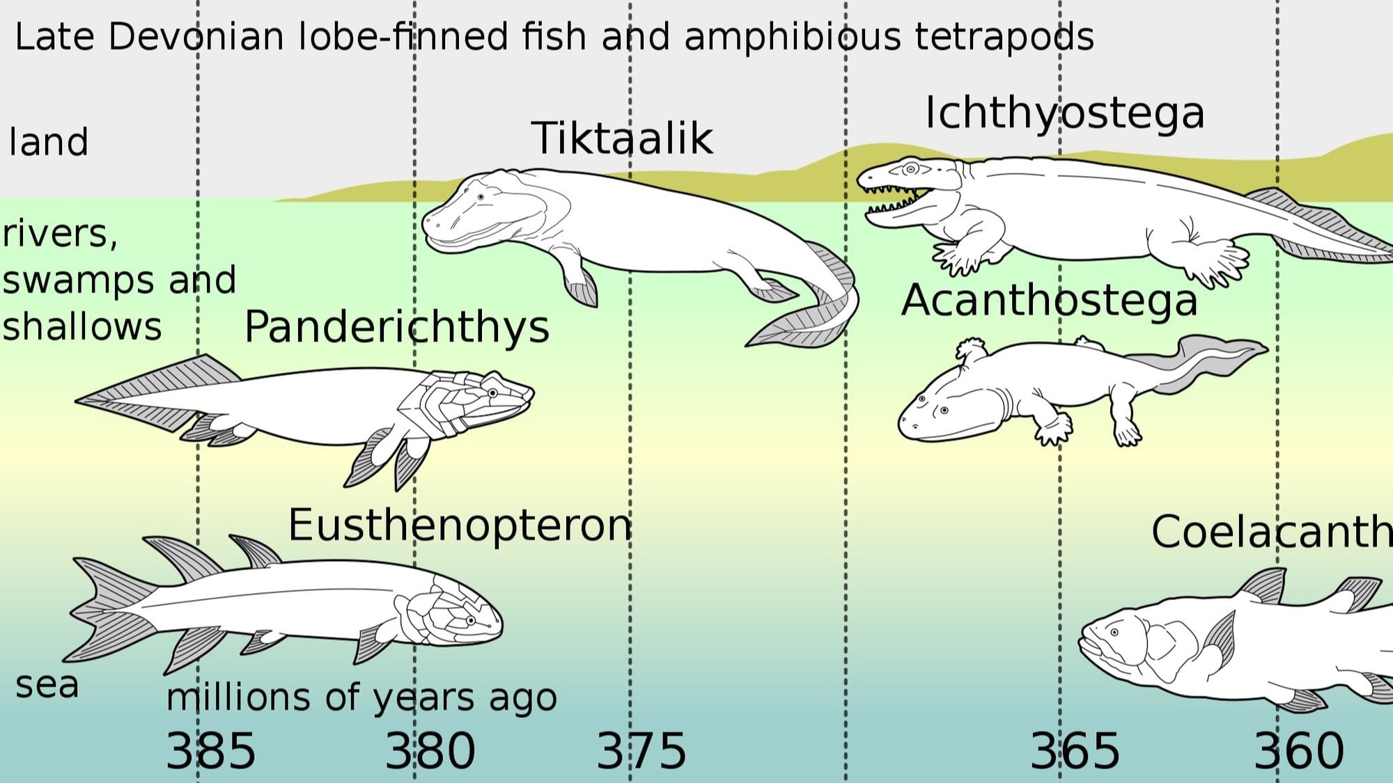 Evrim, bir özelliği veya kabiliyeti ilk edinen organizmanın, o özelliğin veya kabiliyetin tek sahibi olacağını hiçbir zaman söylemez. Karada yaşam sürdürebilme yeteneği de istisna değildir. Yani, Tiktaalik ve benzerlerinin (Elpistostegalia) su-kara geçişinde oluştuğuna dair kuşku yok.