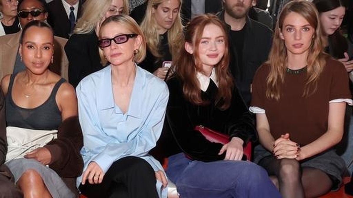 Prada’s front row was a masterclass in personal style. Kerry Washington chose a signature Prada combination: a gray sweater tucked into a billowing skirt, topped with an oversized leather jacket. Carey Mulligan, Sadie Sink, and Maya Hawke each put their own spin on fall layering, demonstrating that two shirts are indeed better than one. Mulligan opted for upscale minimalism with a blue poplin button-down over a white satin top, while Sink and Hawke each layered tees and sweaters in ways that felt both personal and fresh. Eiza González, meanwhile, brought a retro flair with a suede skirt and track jacket, channeling the disco energy of Prada’s recent collections.