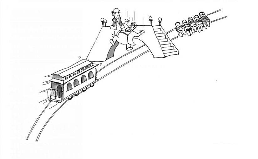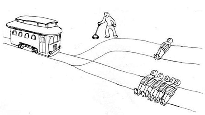 Bir tren, tek bir ray hattı üzerinde, kesinlikle kaçamayacak ve trenin çarpması durumunda tamamı kesinlikle ölecek konumda olan 5 kişinin üzerine gitmektedir.
