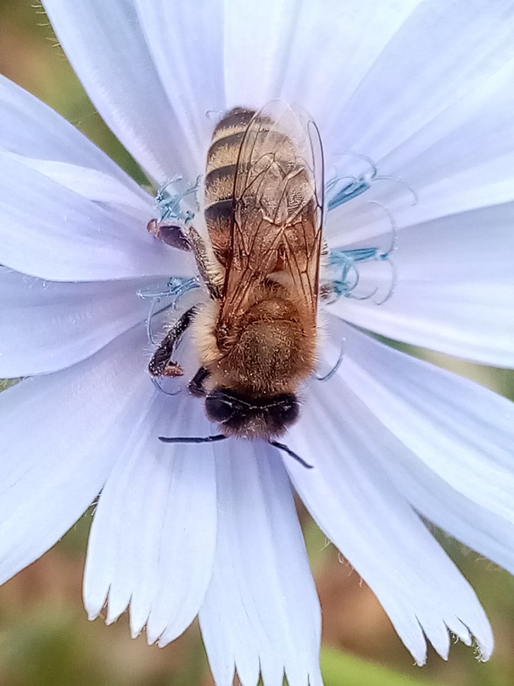 Beyaz hindiba (Cichorium intybus) üzerinden polen/nektar toplayan bir bal arısı. Bu gözlem 30 Haziran 2023 tarihinde Kayseri'nin Felahiye ilçesinde düşük çözünürlüklü telefon kamerası ile 39°05'14.0"N 35°33'47.5"E koordinatlarında yapılmıştır.