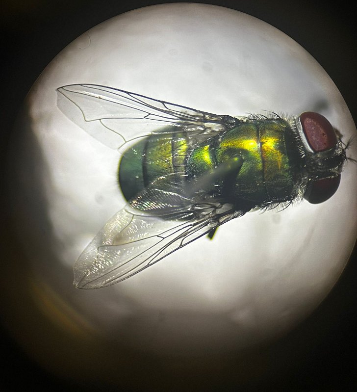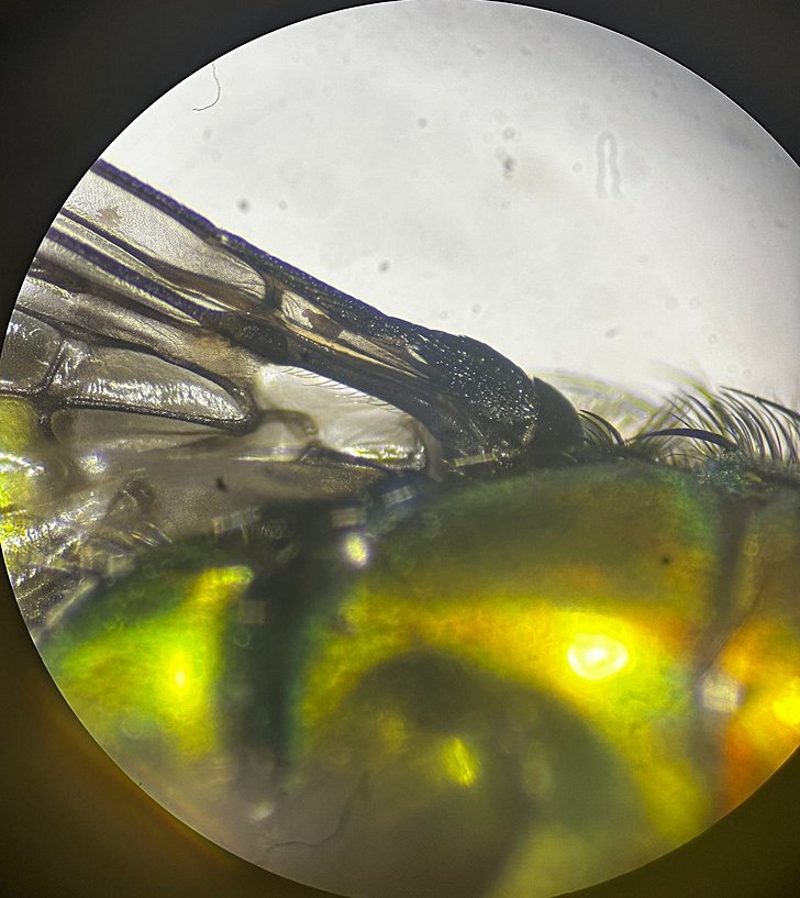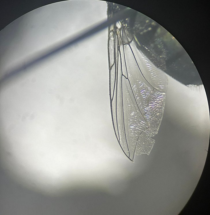 Chrysomya albiceps türünün kanat morfolojisine stereo mikroskop altında bakıldığında Anterior wing(ön kanat) yapısında Costa ile Subcosta damarlarının ara bölgesi transparan/görünmez renklidir.