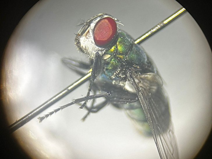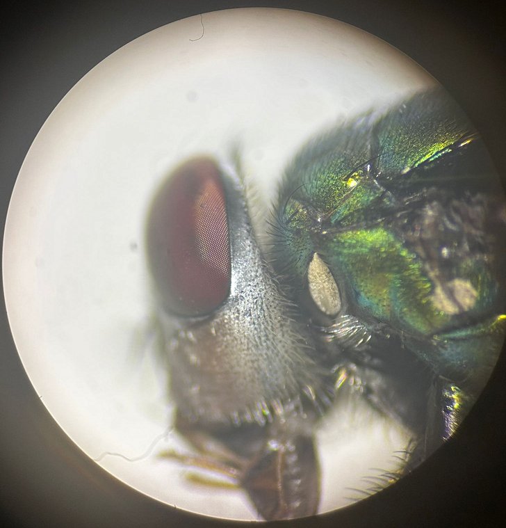 Chrysomya cinsine ait morfolojik bir karakter olan genal açıklığın beyazımsı-sarı renkli olduğu gözlemlenmektedir.