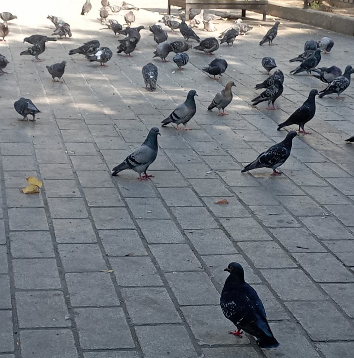 Çapa'da bir parkta ekmek kırıntıları gibi şeyleri yiyen bir sürü kaya güvercini.