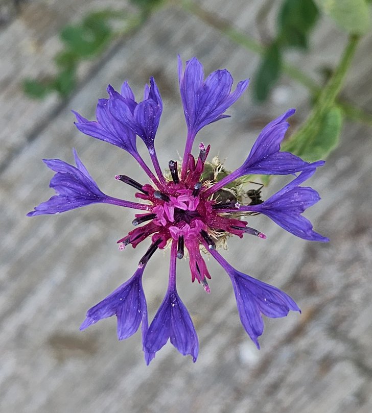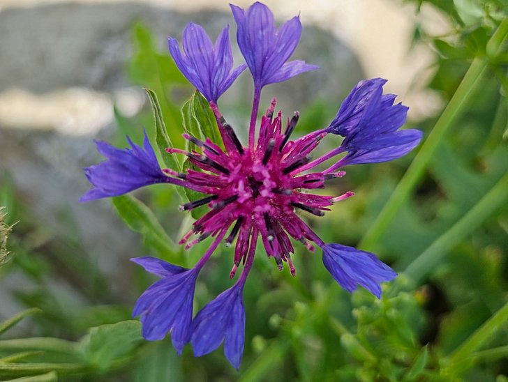 20-60 cm boylanabilen, genellikle tabandan dallanmış, tek yıllık otsu bir türdür. Gövdeler tekil, dallanmış veya yayılı; gri renkte seyrek kaba tüylüdür. Yapraklar gri renkte kaba tüylü; alttakiler saplı, dikdörtgenimsi, 5–10 cm, tam kenarlı veya sığ tüysü bölmeli, küt uçlu; orta ve üsttekiler sapsız, şeritsi, mızraksı veya dikdörtgenimsi, tam kenarlı ve dikensi uçludur. Çiçeklenme Mayıs-Temmuz aylarında; çiçekler tekil; involukrum yumurta-çan biçimli, 15–20 mm; involukrumu oluşturan pulsu yapraklar (filariler) yeşil, yumurtamsı (dışta) veya dikdörtgenimsi (içte), tüysüz, kenarlar ve dik uzantılar gümüşümsü beyaz-kahverengi, ince ve kuru zarlı, 1.5-2 mm narin dişli; çiçekçikler 25–35; üreyimsiz çiçekçiklerin taç yaprakları yayılı, koyu mavi, 25–30 mm, dışa doğru genişleyen; üreyimli çiçekçikler eflatun, yaklaşık 15 mm´dir. Tohumlar kahverengi, 4.5–6 mm, papuslara yakın yerleri kısa havlı, diğer kısımlar tüysüz; dıştaki çiçekçiklerin papusları 2-8 mm düzensiz sert kıllı, içte kalanlar 1.5 mm ve narindir.