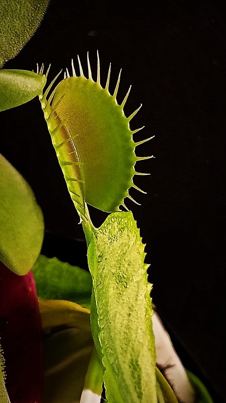 Etobur bitki koleksiyonumdan: Dionaea muscipula. 2. Fotoğrafta un kurdu ile beslediğim kapanın sağlıklı bir şekilde sindirim yaptığını ve tekrar kapanını açtığını görebilirsiniz. Etobur bitkiler avladığı böceklerin kitin yapılı dış kabukları hariç kalan dokuların neredeyse tamamını sindirebilir. Beslenen kapanın tekrar açılması durumunda böceğin kanat, bacak veya dış kabuğunu görebilirsiniz.