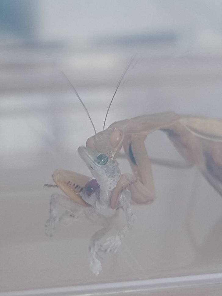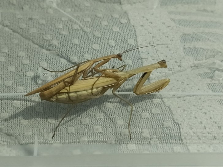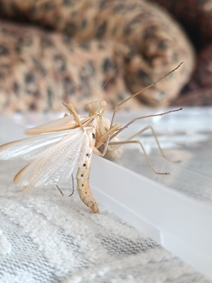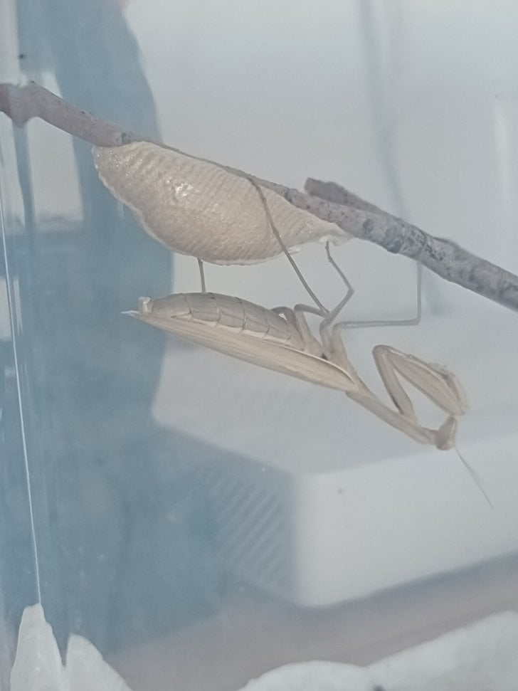 Bu yaz bahçemizde dişiyi bulduğumda her zamanki gibi yalnızca besliyordum, yine bahçemizde erkek bir bireyle karşılaştığımda çiftleştirmeyi, yavruların sağlıklı bir şekilde bahara ulaşmalarını ve tekrar doğaya kazandırmayı düşündüm. bu süreçte çiftleşme öncesi dişi cinsel olgunluğa ancak 2 hafta sonunda ulaştı, bu süreçte önüne gelen her canlıyı avlayıp yiyebilecek potansiyele sahipti. fotoğraflarda da görüldüğü gibi küçük boyutta kertenkeleleri dahi avlayıp, tamamen bitirebilecek (kemik ve diğer sert dokular dahil) kadar açtı. çiftleşme sonrası erkeği maalesef kurtaramadım, aslında kurtarabilirdim fakat müdahale etmek istemedim doğrusu, çünkü bahçemizde başka bir birey yoktu, çiftleşme sonrası (2 kez çiftleştiler) erkek çok enerji harcadığından çabucak ölür bu yüzdende boşa gitmesinden ziyade dişiye besin olmasının mantıklı olacağını düşündüm. çiftleşmeden 1 hafta sonra (yani bu gece) Ootheca denen yumurta kesesini bıraktı, benim satmak gibi bir amacım asla olmadığı için Oothecayı balkonda saklamayı düşünüyorum, çünkü kışa doğru yumurtalar diyapoz denen kış uykusu tarzı bir evreye girerler ve sıcaklıklar tekrar düzeldiğinde yumurtalar gelişir ve yavrular yumurtadan çıkarlar. ben de çoğunu tekrar bahçeye bırakacağım için diyapoza girmesi için balkonda saklayacağım, baharda havalar düzeldiğinde yumurtaların açılmasına izin vereceğim ve tekrar bahçemize salacağım yavruları.