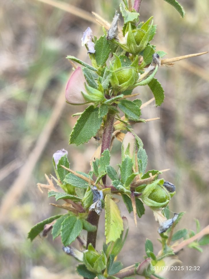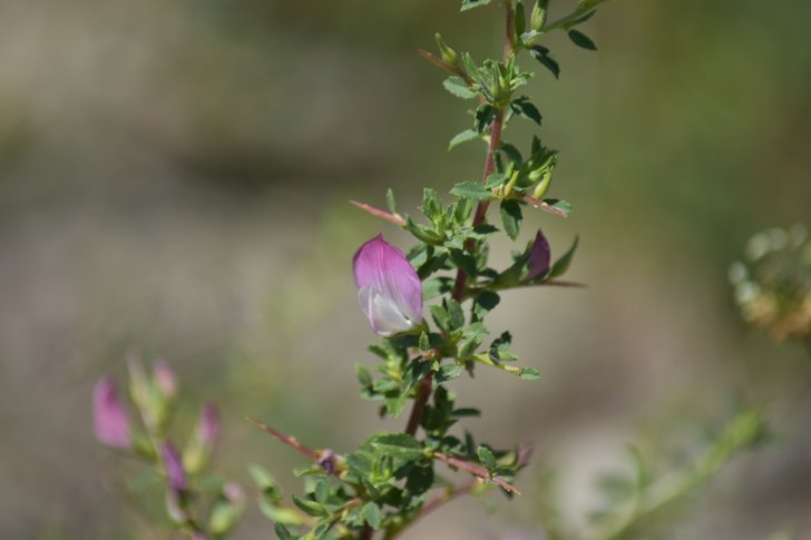 30-60 cm arasında boylanabilen, çok yıllık bir türdür. Gövde sivri dikenlidir ve kıvrımsız şekilde yukarı doğru yükselir; sıklıkla kısa sapcıklı veya sapsız salgı bezleri ve uzunca salgısız tüylerle kaplıdır, bazen tüysüz de olabilir. Üst gövde yaprakları sıklıkla tek yaprakçıklı birleşik yaprak formunda, diğerleri üç parçalı birleşik yaprak formundadır; yaprakçıklar 5-20 x 3-10 mm boyutlarda, yumurtamsı-dikdörtgenimsi yapıdaddır ve kenarları ince dişlidir. Çiçeklenme dönemi Mayıs-Ağustos ayları arasında gerçekleşir;  çiçekler kısaca sapcıklıdır ve genellikle yaprak koltuklarında tek-tek bulunurlar; çanak 5-10 mm uzunlukta ve çan şeklindedir,  2/3-3/4'ünden şeritsi-mızraksı 1-3 damarlı loblara bölünmüştür, yüzeyi tüysüz veya  sapsız-neredeyse sapsız salgı bezleri ile kaplıdır, bazen uzunca salgısız tüylerde görülebilir; taç 6-10 mm boyda, pembe renklte, nadiren beyaz renktedir; bayrakçıkta sıklıkla eflatun çizgiler bulunur.  Baklamsı meyve yumurtamsı formda, salgılı tüylü-tüylü, 1-3 tohum taslaklıdır; tohumlar 2 mm çapta daire şeklindedir, yüzeyleri siğilli veya pürüzsüzdür.