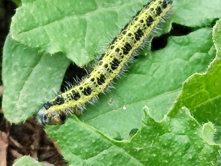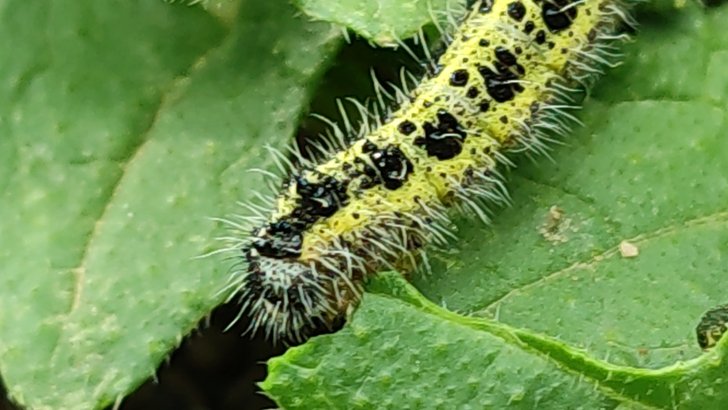 Bir tırtıl ve yakın bir konumda bulunan yetişkin kelebeğin fotoğrafı.Büyük beyaz kelebek Türkiye de özellikle Trakya, Marmara, Ege, Batı Akdeniz, Doğu Akdeniz, İç Anadolu, Batı Karadeniz, Orta Karadeniz, Doğu Karadeniz, Doğu Anadolu,bölgelerinde bulunur.