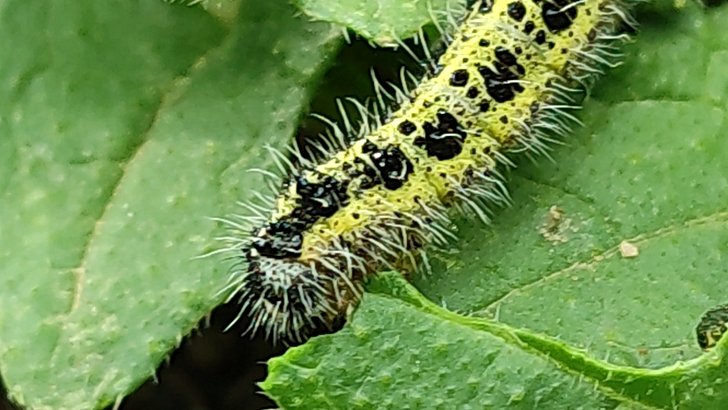 Bir tırtıl ve yakın bir konumda bulunan yetişkin kelebeğin fotoğrafı.Büyük beyaz kelebek Türkiye de özellikle Trakya, Marmara, Ege, Batı Akdeniz, Doğu Akdeniz, İç Anadolu, Batı Karadeniz, Orta Karadeniz, Doğu Karadeniz, Doğu Anadolu,bölgelerinde bulunur.