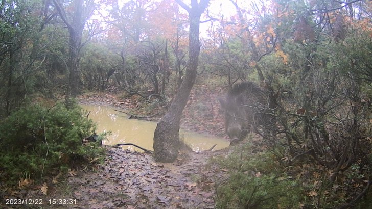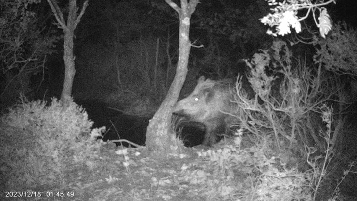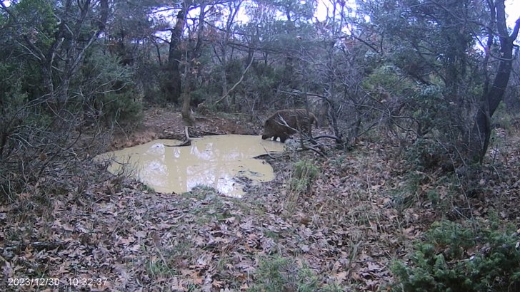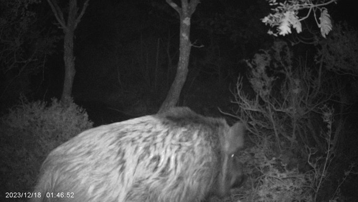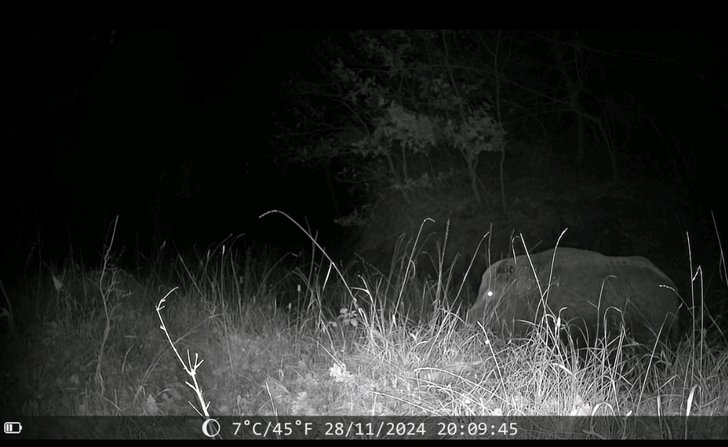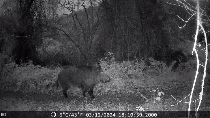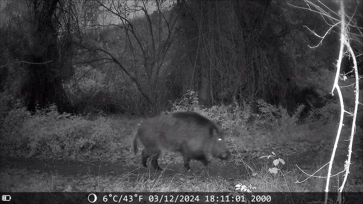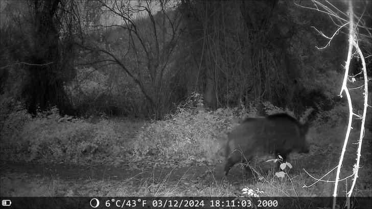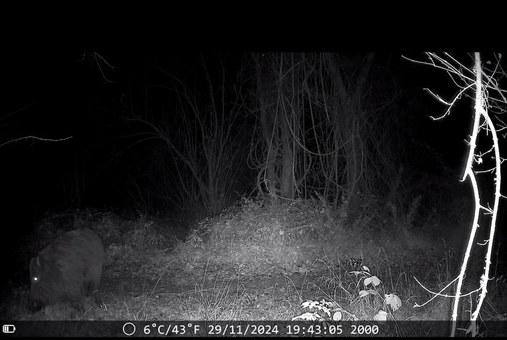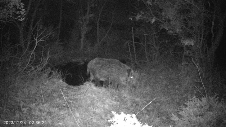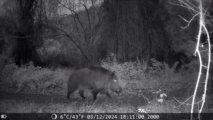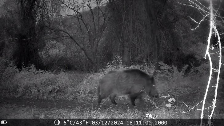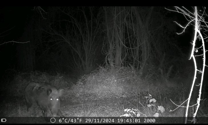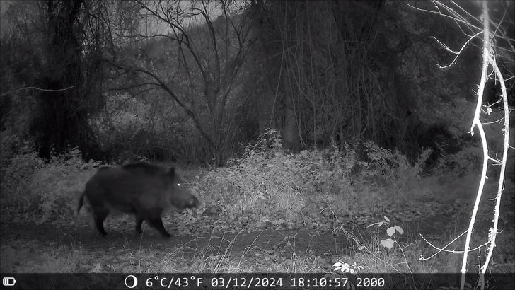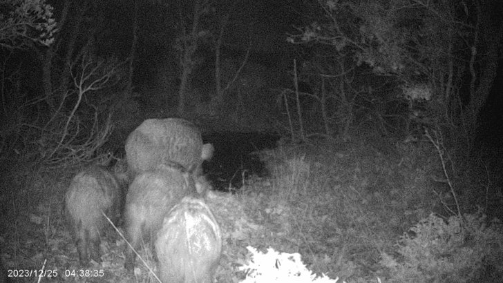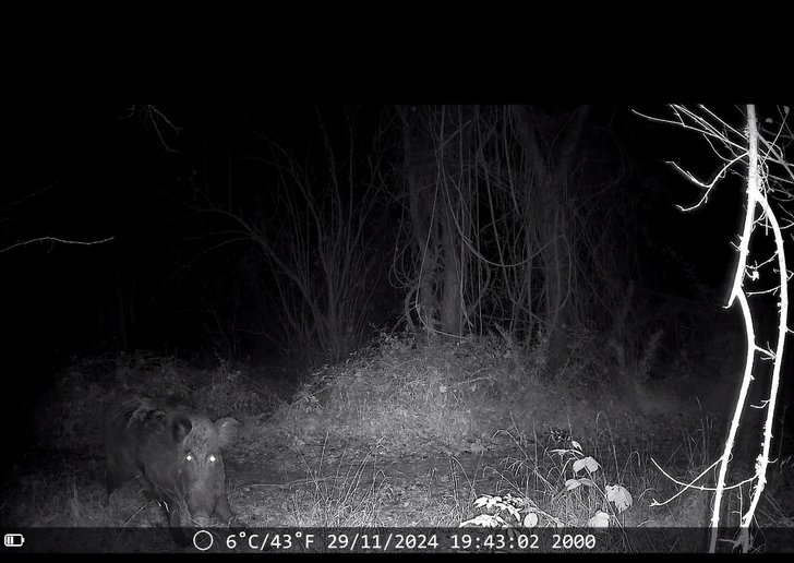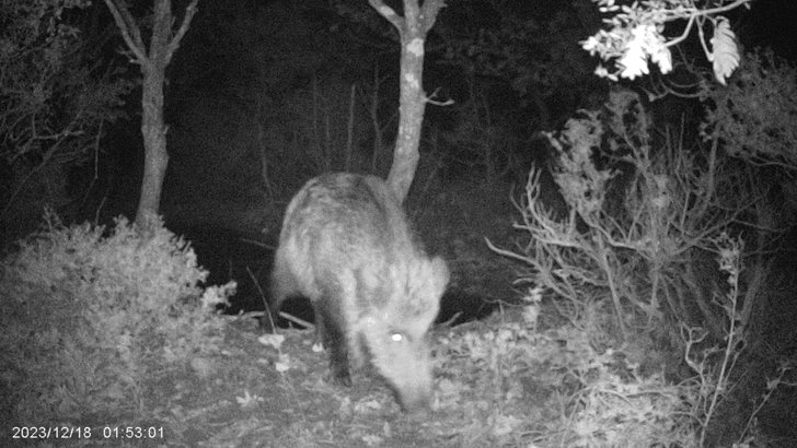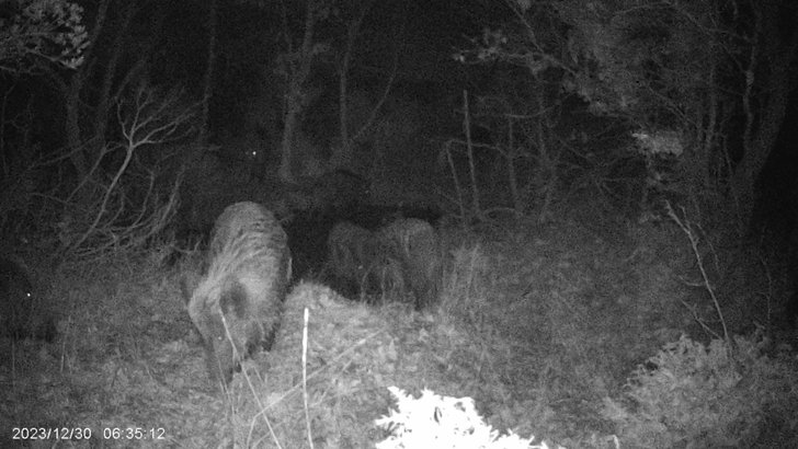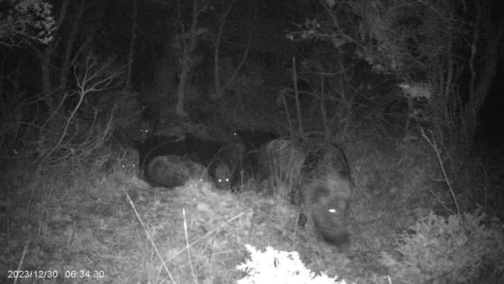 Fotokapana yansıyan yaban domuzu sürüsü. 1 adet azılı duşta.
