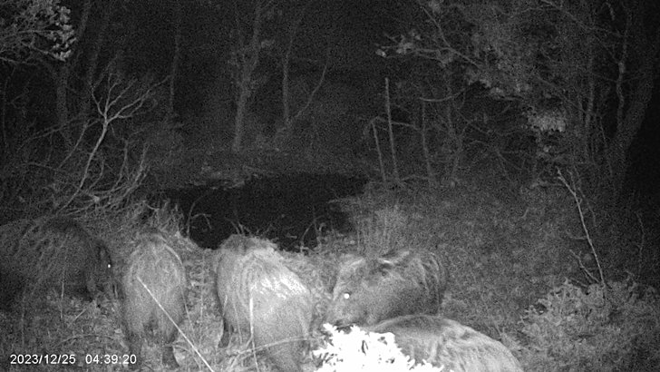 Fotokapana yansıyan yaban domuzu sürüsü. 1 adet azılı duşta.