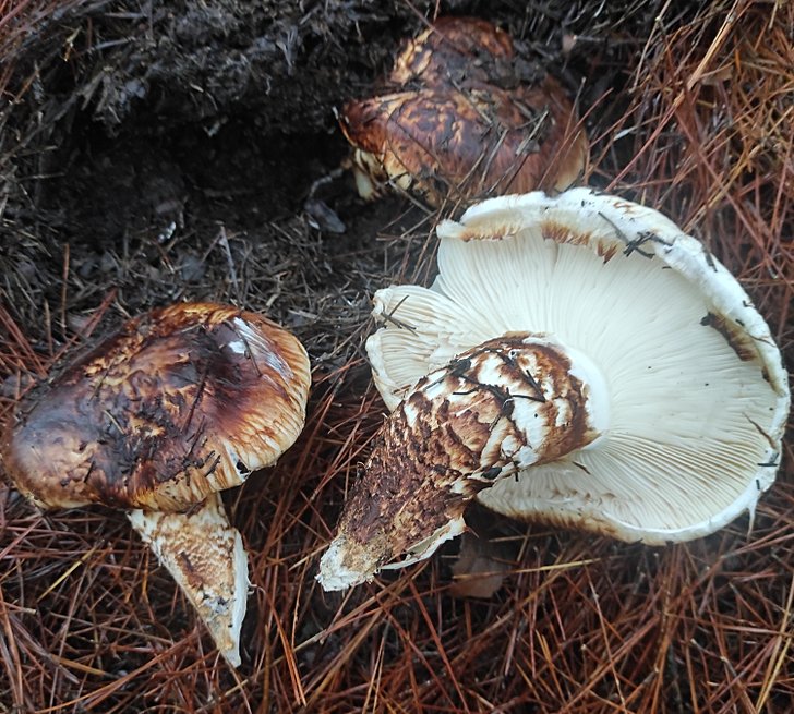 Hepsini Gaziantep'in çam ormanlarından topladığım mantarlardan Koyu Kahverengi ve desenli olarak karşımıza çıkan Tricholoma caligatum, Türkçe adıyla Nergis mantarı, gerçekten de nergis gibi hoş bir kokuya sahiptir. Görseldeki diğer tricholomalar gibi Çam ağaçları ile mikorizal ilişki içerisindedir. Büyük örnekler acı bir tada sahiptir lakin bu acılık 5-10 dakika kaynatılmak suretiyle giderilebilir ve sonrasında istediğiniz şekilde hazırlayıp yiyebilirsiniz. Sap ve şapka kısmındaki kahverengi bölgeler özellikle yağmurlu zamanlarda ciddi toprak tutucudur ve sapın üst kısmından şapkanın da kenarlarından tutup soymak suretiyle kolaylıkla kurtulabilirsiniz. Bu mantarın Gaziantep içerisinde dağılımı oldukça kısıtlıdır, öyle ki sadece bir kere karşıma çıktı.