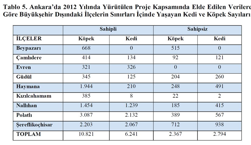Bu konuda Türkiye'de yapıldığını gördüğümüz sadece 1 adet akademik sayım çalışması bulunmaktadır. 2012 yılında Ankara Büyükşehir Belediyesi, Ankara Üniversitesi Veteriner Fakültesi ve Tüm Bilimsel, Kültürel ve Stratejik Araştırmalar Merkezi (TÜBİKAM) Derneği işbirliği ile bir proje yürütülmüş ve proje kapsamında Ankara’da bulunan sahipli ve sahipsiz köpek ve kedilerin sayımı yapılmıştır.[9] Sayımda, sahipli hayvanların sayımı için Ankara Bölgesi Veteriner Hekimleri Odası'na kayıtlı 149 muayenehane ve hastanenin 132’si doğrudan ziyaret edilerek "kuduz aşılaması kayıtları" üzerinden değerlendirme yapılmış, bakımevlerinde bulunan hayvanların sayımı için gönüllü kuruluşlara ait 3, yerel yönetimler bünyesinde bulunan 11 adet geçici bakımevi ziyaret edilmiştir. Sokakta yaşayan hayvanların sayımı için “World Society for the Protection of Animals (WSPA)” tarafından önerilen yöntem tercih edilerek, Büyükşehir sınırları içinde seçilen 67 mahallede, kiralanan toplam 7 araçla, belirlenen her noktada üçer kez (gündoğumu, akşam ve gece) sayım yapılmıştır. Büyükşehir dışında kalan 9 ilçede ise kaymakamlıklar aracılığıyla köy ve mahalle muhtarlarından alınan anketlerle değerlendirme yapılmıştır. Elde edilen veriler istatistiksel olarak değerlendirilerek aşağıdaki sonuçlar elde edilmiştir.