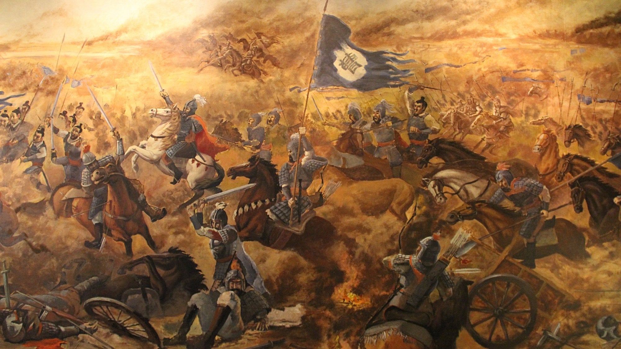 M.S. 220 Yılında Cao Cao yürüyüş halindeyken; ona karşı Shu Hanedanlığı'ndan Liu Bei ve Wu Hanedanlığı'ndan Sun Quan tarafından yönetilen, Guan Yu gibi bir dizi güçlü ve tecrübeli generali de bünyesinde bulunduran yeni bir koalisyon kuruldu. Guan Yu'nun dövüş becerileri ve stratejisi o kadar iyiydi ki, daha sonradan Guan Gong (Guandi olarak da bilinir) olarak isimlendirildi. Savaş esnasında Guan Yu, askerlerin nehirden geçişinden sorumluyken hizmet ettiği Liu Bei, yolculuğuna askerleriyle karadan devam etti.