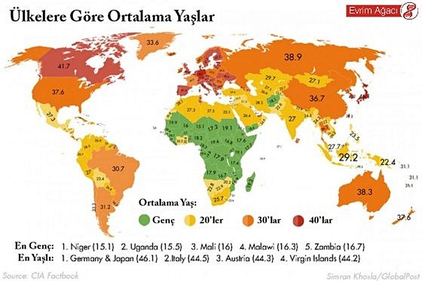 Görselde, 2014 verilerine göre Dünya'daki farklı ülkelerde yaşayan insanların ortalama yaşları gözüküyor. Afrika'daki ülkelerin düşük ortalaması, çoğu insanın ileri yaşlara kadar hayatta kalamaması ve yüksek üreme oranlarından kaynaklanıyor. Dünya'daki en yaşlı insanları barındıran ülkelerin başını ise Almanya, Japonya, İtalya, Avusturya ve Virgin Adaları çekiyor. Türkiye ise 29.6 ile çoğunlukla 20'lerinin sonundaki insanlardan oluşan bir ülke profili çiziyor.