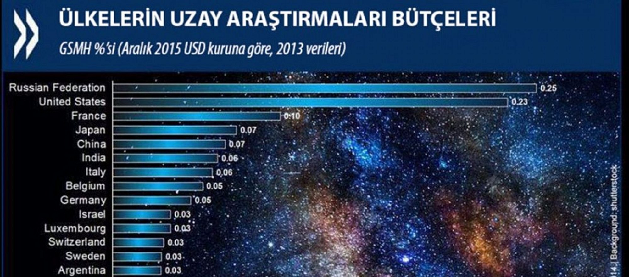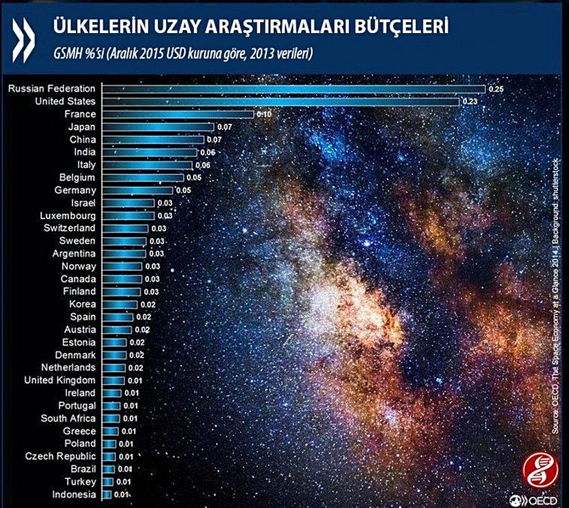 Görselde, OECD ülkelerinin gayrısafi milli hasılalarının (GSMH) ne kadarlık bir kısmını uzay araştırmalarına ayırdıkları % cinsinden gözükmektedir. Örneğin 1 numarada yer alan Rusya, gelirinin %0.25'ini uzaya ayırırken, sondan ikinci sırada yer alan Türkiye Cumhuriyeti gelirinin %0.01'ini uzay araştırmalarına ayırmaktadır.