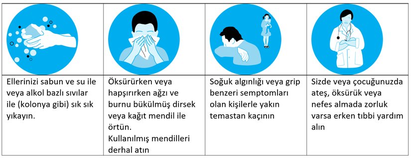 Ellerinizi sık sık yıkayın veya en az yüzde 60 alkol içeren alkol bazlı bir dezenfektan kullanın, iyi solunum hijyeni uygulayın (öksürdüğünüzde veya hapşırdığınızda ağzınızı ve burnunuzu bükülmüş dirsek veya kağıt mendil ile örtün ve hemen kullanılmış kağıt mendili atın), öksüren veya hapşıran kişilerle yakın teması kesin.