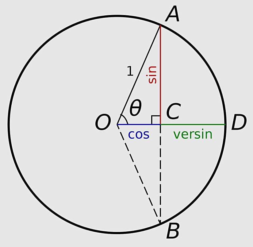 versin(θ):=2sin2 (θ2)=1−cos(θ) {\textrm {versin}}(\theta ):=2\sin ^{2}\!\left({\frac {\theta }{2}}\right)=1-\cos(\theta )\,
