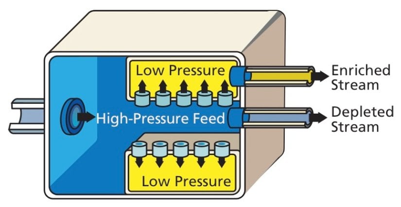 ABD Nükleer Regülasyon KomisyonuBu yine de uranyumu zenginleştirmeye engel olmamıştır; çünkü U234 ile U235 atomları olan UF6 molekülleri, U238 atomlu moleküllere kıyasla daha hafiftir ve daha kısa sürede difüze olur. Salınan UF6 gazının yeteri kadar filtrelenebilmesi, başka bir deyişle, yeteri kadar U235'e sahip olabilmesi için bir değil yüzlerce zardan geçmesi gerekmektedir. Nükleer yakıtta kullanılacak UF6, filtreden geçtikten sonra borulardan geri çekiliyor, sıvı hale gelecek şekilde yoğunlaştırılıp konteynerlere aktarılıyor, burada soğumaya bırakılıp katılaştıktan sonra yakıt imalat tesislerine gönderiliyordu. Aşağıdaki şemada gaz difüzyon yönteminin nasıl işlediği gösterilmektedir.