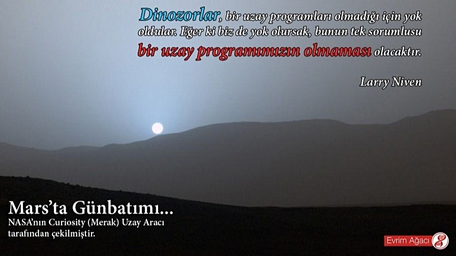 Fotoğrafta gördüğünüz, Kızıl Gezegen Mars üzerindeki bir günbatımıdır. NASA'nın Curiosity uzay aracı tarafından çekilmiştir. Bilimkurgu yazarı Larry Niven'in de belirttiği gibi, 21. yüzyılda "uzay programları" olarak özetlenebilecek uzay araştırması çalışmaları, insanlığın yapması gereken en önemli teknolojik atılımların başında gelmektedir.
