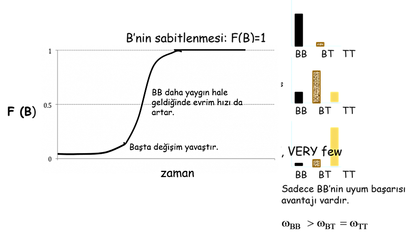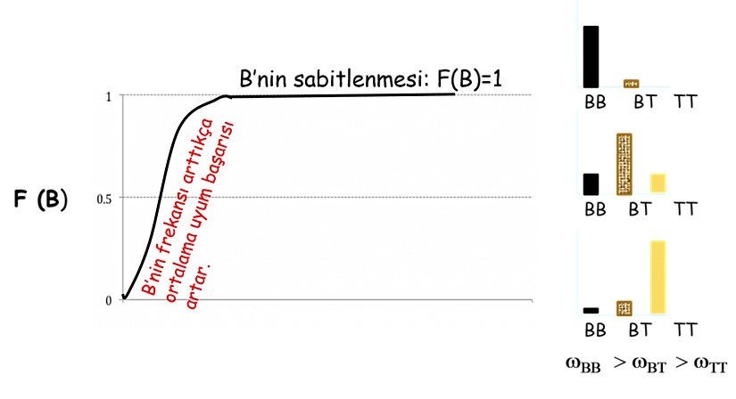 Bu durumda, sağ taraftaki grafiğe ulaşırız: en yüksek uyum başarısı (en düşük seçilim baskısı) BB genotipinde olduğu için, alel frekansı nesiller geçtikçe ondan tarafa kayacaktır. Yani popülasyon içerisinde sürekli olarak BB bireylerin sayısı artacak, BT ve TT bireylerin sayısı azalacaktır. Bu süreç, ya popülasyondaki bireylerin frekansı 1'de (veya 0'da) sabitlenene kadar, ya çevre ve seçilim baskısı değişene, ya da artık etki edecek bir çeşitlilik kalmayıncaya kadar devam eder. Ancak tekrar söylemek gerekirse, genelde bu sabitlenmeler gerçekleşmeden önce popülasyon veya çevre değişir, böylece evrimin gidişatı da yön değiştirir.