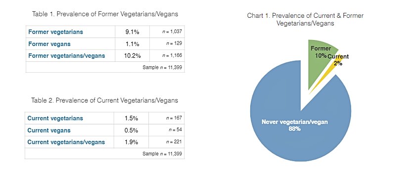 Araştırmaya göre ABD içerisinde an itibariyle %2'lik bir popülasyon kendilerini "vegan ya da vejetaryen" olarak, %10'luk bir popülasyon ise eskiden vegan/vejetaryen olarak, %88'i ise "asla vegan/vejetaryen olmamış" olarak tanımlıyor. Fast Company'den Jessica Leber şöyle söylüyor: