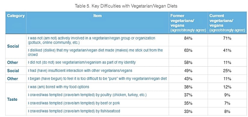 Araştırmacılara göre insanların etsiz diyetten vazgeçme nedenlerinin sosyal sebepler mi (vejetaryen/veganların bu diyetlerinden ötürü azınlık baskısı gördükleri araştırmalarla kanıtlanmıştır), yoksa diyetin kendisinin zorluklarından mı (sağlık ve ekonomik nedenlerle) olduğu çok net değil. Leber'e göre, sevgili durumu da önemli bir faktör: eski vejetaryen/veganların %33'ü, etsiz diyetten vazgeçtiklerinde, et yiyen bir kişiyle ilişki içerisinde olduklarını belirtti. Araştırmacılar, makalelerinde şöyle bir sonuca varıyorlar: