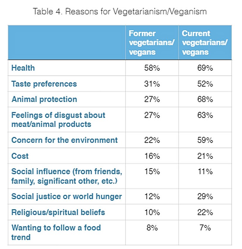 Vejetaryen/vegan diyete geçip de bunu bırakan kişilerin %58'i, sağlıkla ilgili nedenlerin kendilerini en çok motive eden neden olduğunu belirtiyor. %27'si, hayvan haklarını gerekçe olarak gösterse de, bu kişilerin sonradan tekrar et yemeye döndükleri görülüyor. Öte yandan halen vejetaryen/vegan olan kişiler, birden fazla neden saymaya meyilliler.