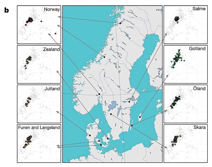Nature dergisinde yayınlanan Viking Dünyasının Popülasyon Genomiği başlıklı makalede, Viking Çağı'nda (750-1050 yılları arasında) Avrupa'dan Grönland'a kadar yayılan İskandinavya popülasyonlarına ait 442 insan genomunun analizi yapıldı ve bu veriler, Vikingler'den önce yaşamış 1000 insana ait bulgular ve günümüzde yaşayan 3.855 kişiden alınan genomlarla kıyaslandı.[1] Bu araştırma sonucunda, Viking Çağı'nda İskandinavya yönlü gen akışının güneyden ve doğudan olduğu anlaşıldı. Bu süreçte İngiltere'ye Danimarka'dan, Baltık Denizi bölgesine İsveç'ten; İrlanda, İzlanda ve Grönland'a Norveç'ten göçler olduğu görüldü. Bu durum, Viking Çağı'ndaki İskandinavya toplumlarının diğer Avrupa ülkelerinden de dikkate değer miktarda gen aldığını gösteriyor.