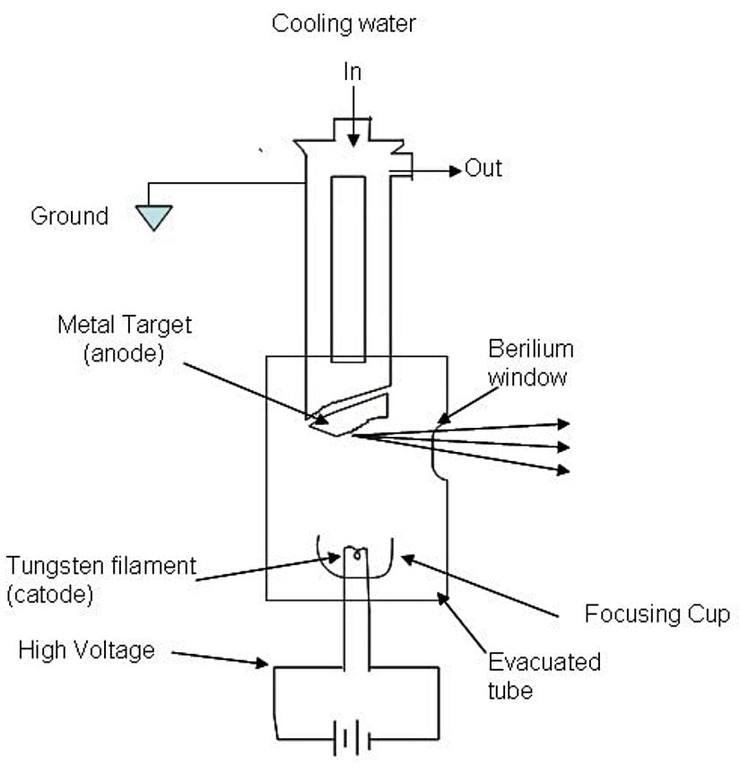 X ışını tüpleri, çoğu analitik cihazda X ışını radyasyonu üretmek için bir araç sağlar. Boşaltılmış bir tüp, üzerinde metal bir plaka bulunan bakırdan yapılmış çok daha büyük, su soğutmalı bir anotun karşısında bir katot görevi gören bir tungsten filamanı barındırır. Metal plaka şu metallerin herhangi birinden yapılabilir: krom, tungsten, bakır, rodyum, gümüş, kobalt ve demir. Filamandan yüksek bir voltaj geçirilir ve yüksek enerjili elektronlar üretilir. Makine, ortaya çıkan ışığın yoğunluğunu ve dalga boyunu kontrol etmenin bir yoluna ihtiyaç duyar. Işığın yoğunluğu, filamandan geçen akımın miktarı ayarlanarak kontrol edilebilir; esasen bir sıcaklık kontrolü görevi görür. Işığın dalga boyu, elektronların uygun hızlanma voltajı ayarlanarak kontrol edilir. Sisteme yerleştirilen voltaj, anoda doğru hareket eden elektronların enerjisini belirleyecektir. Elektronlar hedef metale çarptığında X ışınları üretilir. Işığın enerjisi, enerjiyi kontrol eden dalga boyu ile ters orantılı olduğundan (E=hc=h(1/λ)E=hc=h(1/λ)), X ışını demetinin dalga boyunu kontrol eder.