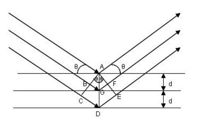 Yukarıdaki şekilde birinci düzleme çarpan kiriş ile ikinci düzleme çarpan kirişin yol uzunlukları arasındaki fark BG+GFBG+GF'ye eşittir. Bu nedenle, iki kırınımlı ışın, yalnızca BG+FG=nλBG+FG=nλ ise eşevreli olarak yapıcı girişimde bulunacaktır. Temel trigonometri bize, iki parçanın, düzlemler arası mesafe çarpı θ\theta açısının sinüsü ile birbirine eşit olduğunu söyler. Böylece, şunu elde ederiz: