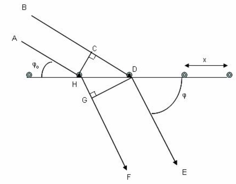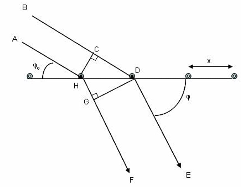 Üstteki şekilde, iki paralel dalga, BD ve AH, theta açısıyla bir eğime çarpıyor. Gelen BD dalgası, eğime ulaşmadan önce AH'den CD kadar daha uzağa gider. Saçılan HF dalgası, DE'den HG mesafesi kadar daha fazla hareket eder. Yani AHGF ve BCDE yolu arasındaki toplam yol farkı CD−HGCD - HG'dir. Yapıcı girişim yoluyla yaratılan yüksek yoğunluklu bir dalgayı gözlemlemek için, CD−HGCD - HG farkı, φ\varphi açısında gözlemlenecek tam sayıda dalga boyuna eşit olmalıdır; yani: CD−HG=nλCD-HG=nλ. Burada λ\lambda, ışığın dalga boyudur. Bazı temel trigonometrik özellikler uygulanarak, çizgiler hakkında şu iki denklem gösterilebilir: