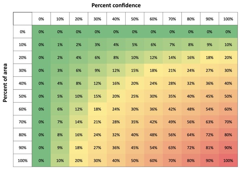 Aşağıdaki grafiğe bir göz atın. Burada üstte güven %si, yanda ise alan %si gösterilmektedir. Bu iki değeri çarparak, kesiştikleri noktadaki yağış olasılığı değerini elde ederiz. Güveniniz %90 ve etkilenen alan %50 ise, yağış olasılığı %45'e eşittir. Grafik simetrik olduğundan, bu değerler zıt olsaydı bile yağış olasılığı yine %45 olurdu. Bu, her bir yağış olasılığına ulaşmanın birden fazla yolu olsa da sonuçta benzer şeyler ifade ettikleri anlamına gelir.