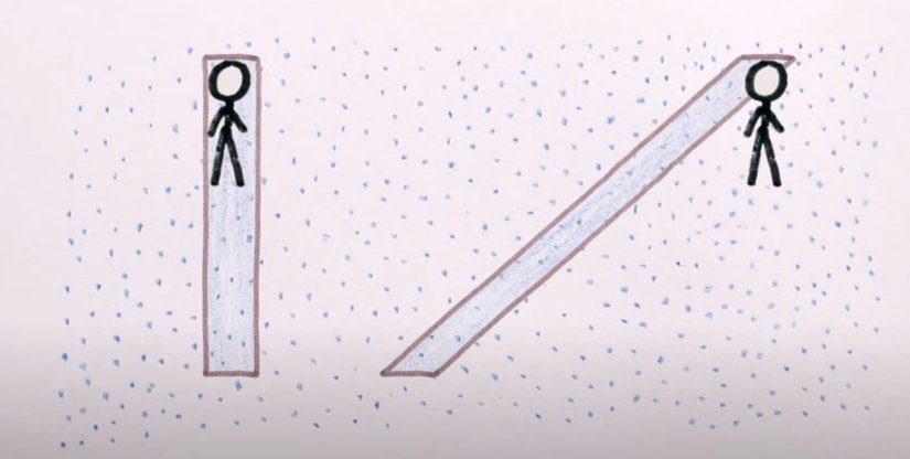 Bunun geometrik nedeni, yataydaki kesit alanınızın sabit olmasıdır: Olduğunuz yerde yukarı doğru uçtuğunuzda, değdiğiniz su damlaları bir dikdörtgen, yani bir paralelogram oluşturacaktır. Sağa sola istediğiniz hızla hareket etseniz de, yine değdiğiniz su damlaları bir paralelogram oluşturacaktır. Bu, aşağıda gösterilmiştir: