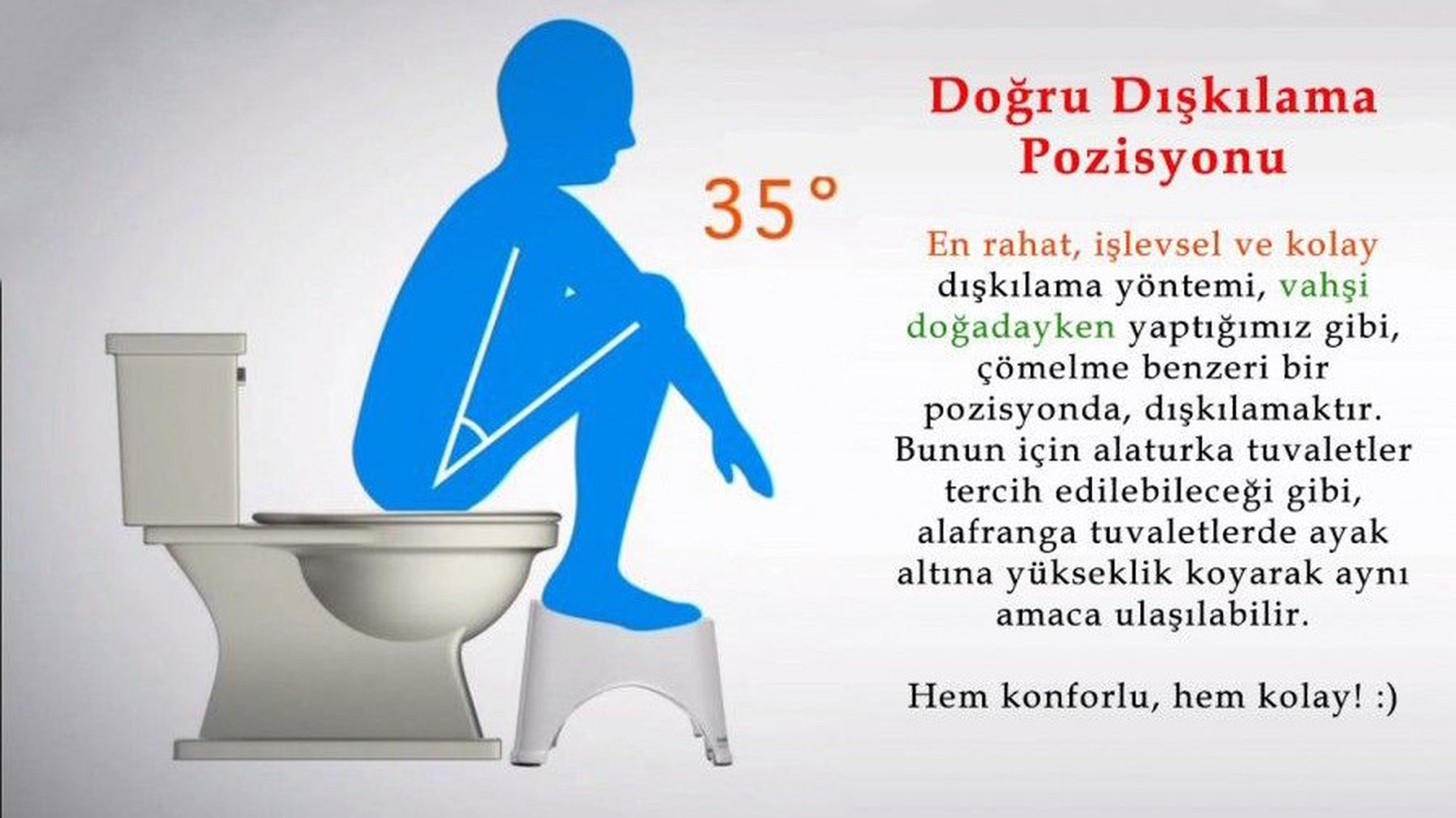 Elbette ki, görselde de gösterildiği gibi, illa "alaturka" olarak bildiğimiz eski tuvaletlere dönmenize gerek yok. "Alafranga" olarak bilinen modern tuvaletlerde dışkılamaya devam etmenize rağmen, minik bir ayaklık sayesinde gerekli açıyı yakalayabilirsiniz.