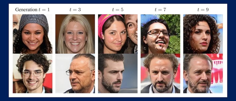 Bir modelin art arda ürettiği resim veri setlerini yan yana koyup baktığınızda yapay zekâ modellerinin geleceğine dair ürkütücü bir tablo ortaya çıkıyor. İnsan yüzleri temalı veri setlerinde her yeni üretimle birlikte çizgiler gözlenmeye başlıyor, araştırmacılar bu çizgiler gibi beklenmedik görüntülere "üretim hataları" (İng: "generative artifacts") adını veriyor.