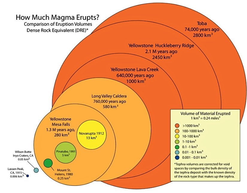 Bu süper patlamalar, alışık olduğumuz en büyük püskürmelerden bile binlerce kat daha güçlüdür. Aşağıda, USGS'nin Yellowstone süper patlamalarını 1980'deki St. Helens Dağı patlamasıyla karşılaştırdığı bir grafik görebilirsiniz. Aradaki fark şaşırtıcıdır: