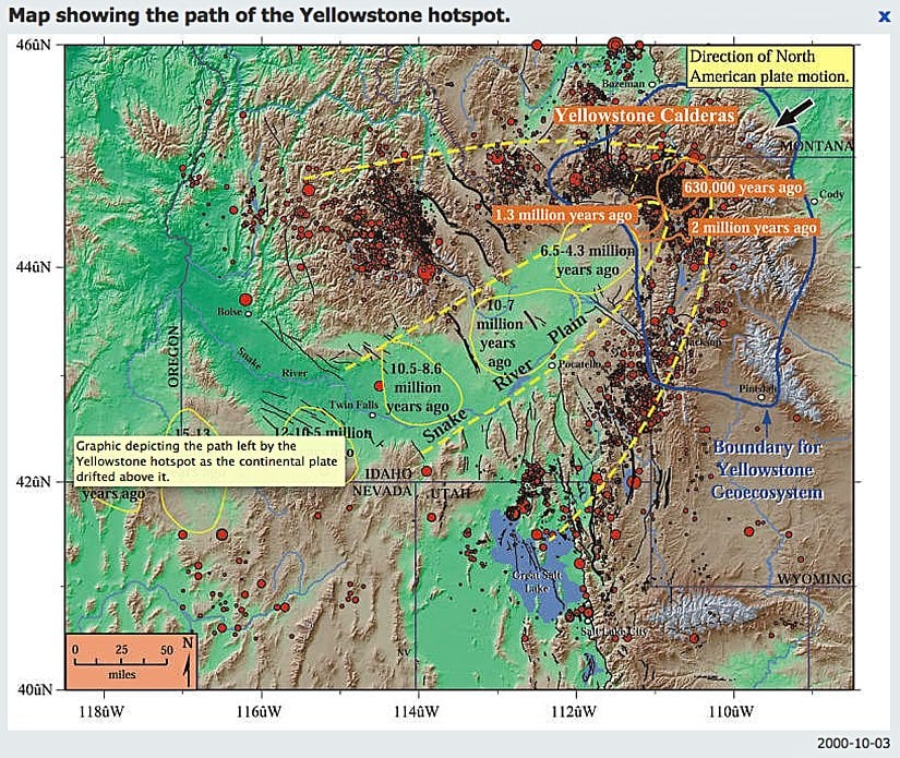 Yellowstone'un altındaki volkanik sıcak noktanın yavaşça kuzeydoğuya doğru göç ettiğini de belirtmek gerekir (ya da daha doğru bir ifadeyle, sıcak noktanın üzerindeki Kuzey Amerika tektonik plakası güneybatıya doğru göç etmektedir). Aşağıda bu göçü görebilirsiniz: